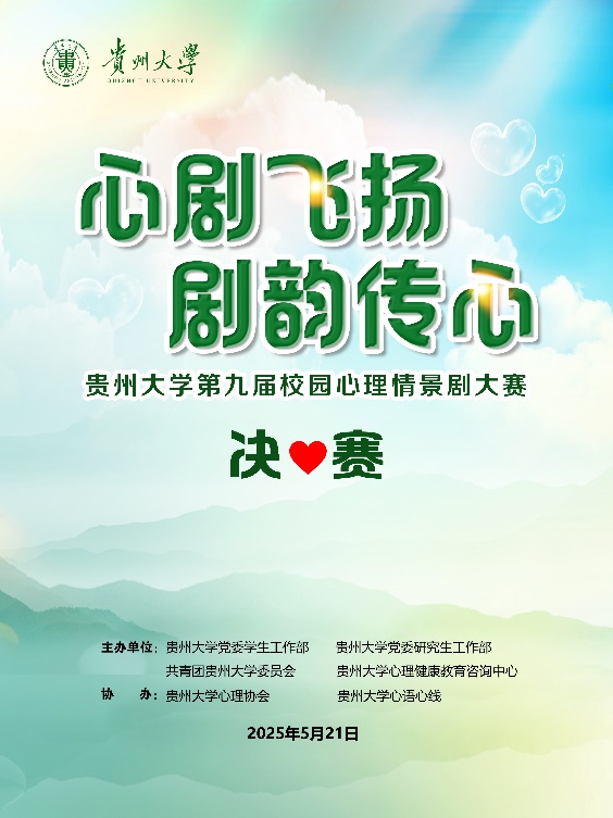 为深入探讨大学生在成长过程中面临的各种心理问题,引导学生关注心理健康,提升自我认知与自我调适能力,5月10日上午,“心剧飞扬·剧韵传心”贵州大学第九届校园心理情景剧大赛预赛在西校区贤正楼107报告厅举行。